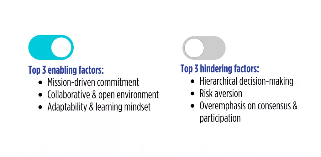 Culture cuts both ways. Around 40–45 percent of respondents describe their organizational culture as a strength that supports change through collaboration and mission commitment. Another 35–40 percent experience culture as a barrier marked by hierarchy, risk aversion or slow consensus. The remaining fifth describe mixed environments where both tendencies coexist. Culture therefore acts as a magnifier: It strengthens what already works and amplifies existing weaknesses.
